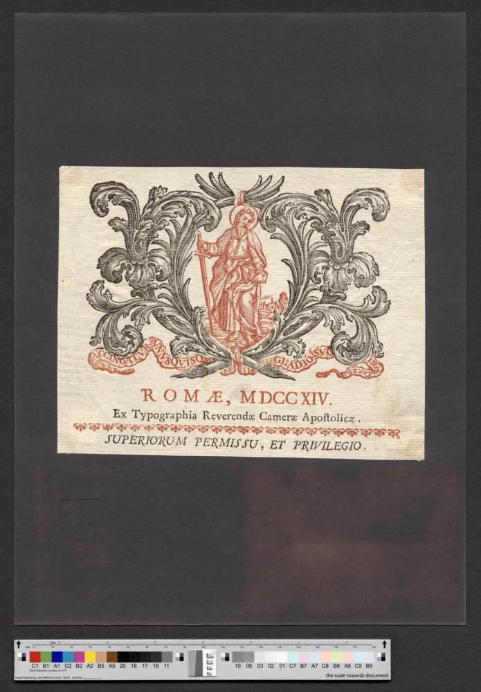 - ROMAE, MDCCXIV. / Ex Typographia Reverendae Camerae Apostolicae. / SUPERIORUM PERMISSU, ET PRIVILEGIO.