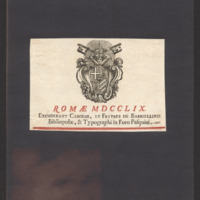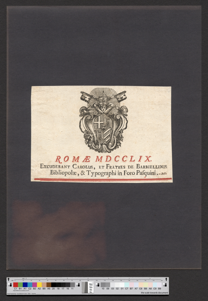 - ROMAE MDCCLIX. / EXCUDEBANT CAROLUS, ET FRATRES DE BARBIELLINIS / Bibliopolae, & Typographi in Foro Pasquini.