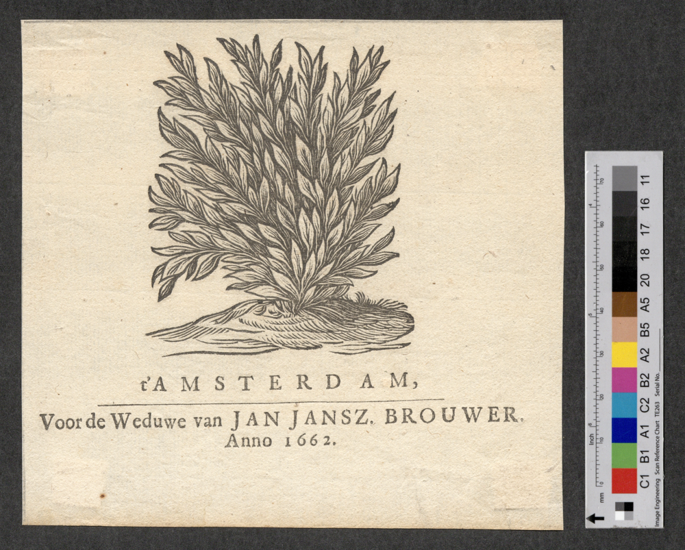 - t'AMSTERDAM, / Voor de Weduwe van JAN JANSZ. BROUWER. / Anno 1662.
