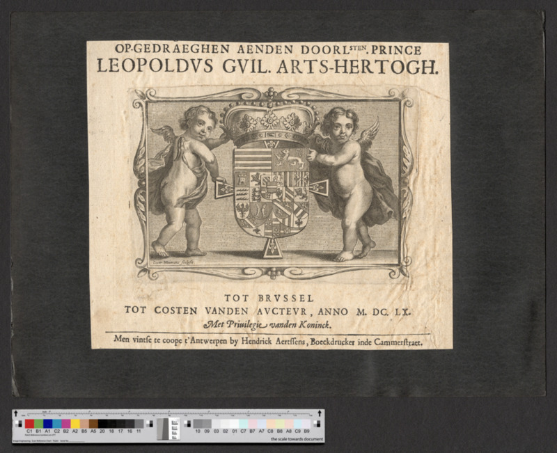 - TOT BRVSSEL / TOT COSTEN VANDEN AVCTEVR, ANNO M. DC. LX. / Met Priuilegie vanden Koninck. / Men vintse te coope t'Antwerpen by Hendruck Aertssens, Boeckdrucker inde Cammerstraet.