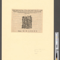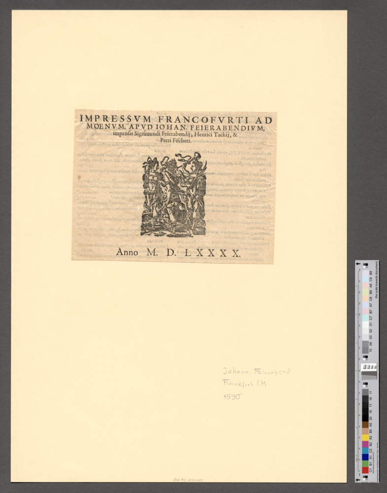 - IMPRESSVM FRANCOFVRTI AD / MOENVM APVD IOHAN. FEIERABENDIVM, / impensis Sigismundi Feierabendij, Henrici Tackij, & / Petri Fischeri. / Anno M. D. LXXXX.