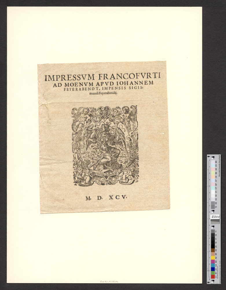 - IMPRESSVM FRANCOFVRTI / AD MOENVM APVD IOHANNEM / FEYERABENDT, IMPENSIS SIGIS- / mundi Feyerabendij. / M. D. XCV.