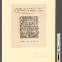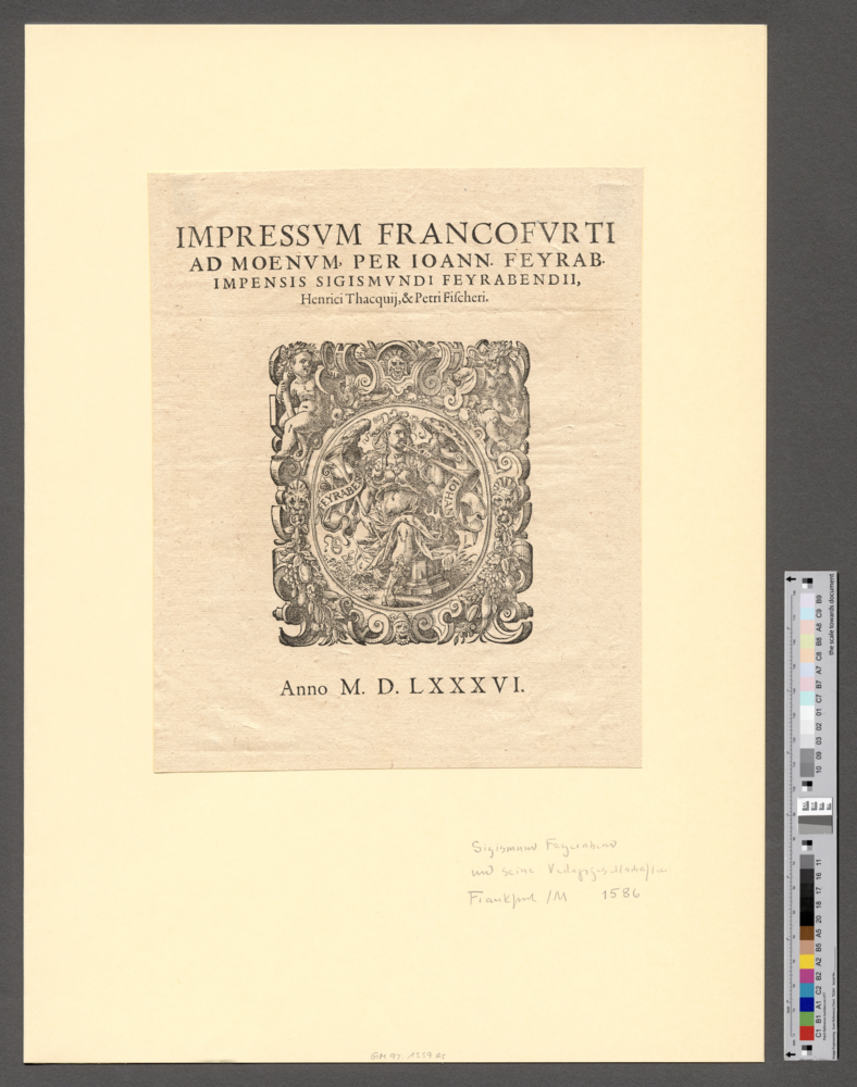 - IMPRESSVM FRANCOFVRTI / AD MOENVM, PER IOANN. FEYRAB. / IMPENSIS SIGISMVNDI FEYRABENDII, / Henrici Thacquij, & Petri Fischeri. / Anno M. D. LXXXVI.