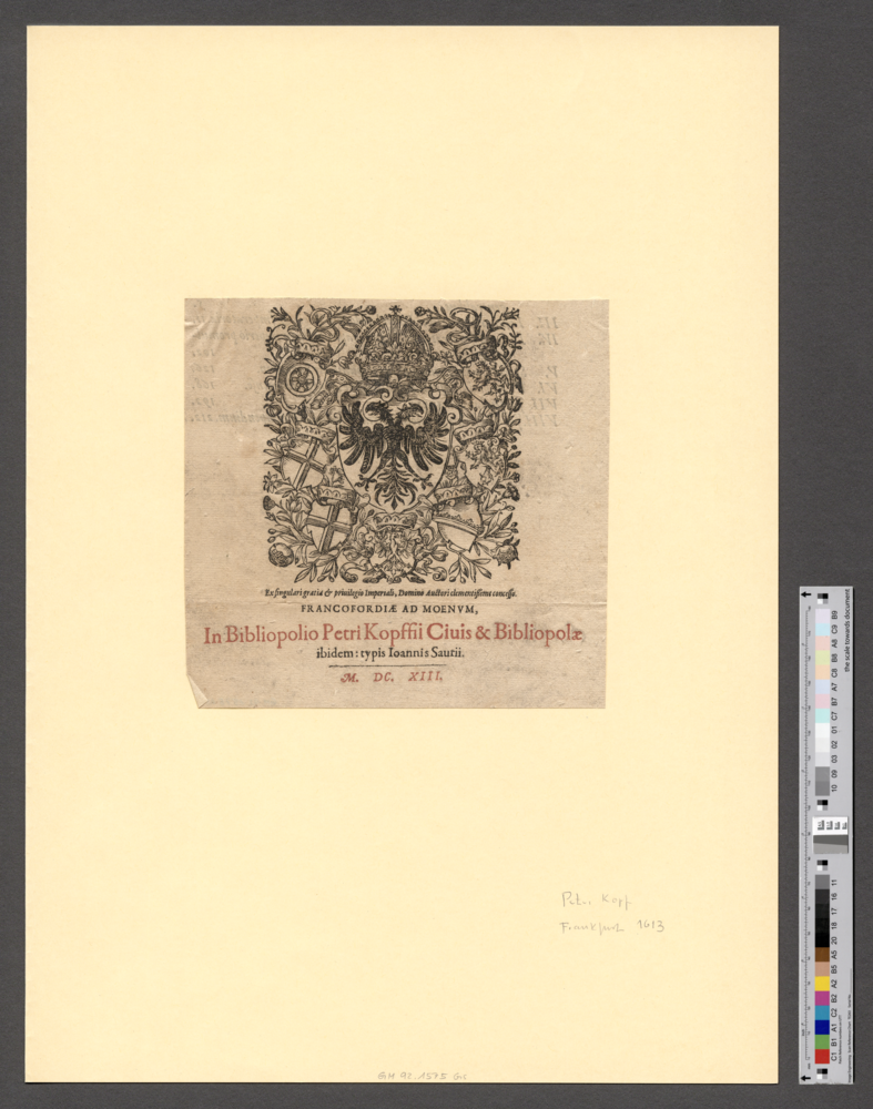 - FRANCOFORDIAE AD MOENVM, / In Bibliopolio Petri Kopffii Ciuis & Bibliopolae / ibidem: typis Ioannis Saurii. / M. DC. XIII.