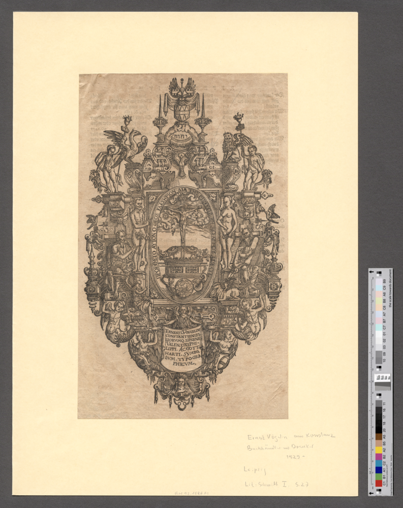 - M.D. C.I. / ERNESTI VOEGELINI / CONSTANTIENS.FI- / LIORVMO.LIPSENS. / VALENTINI.PHI- / LIPPI. AC.GOTT- / HARTI.SŸMBO- / LVM. TYPOGRA / PHICVM.
