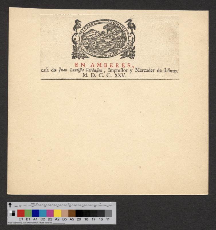 - EN AMBERES, / casa de Juan Bautusta Verdussen , Impressor y Merdader de Libros. / M. D. C. C. XXV.