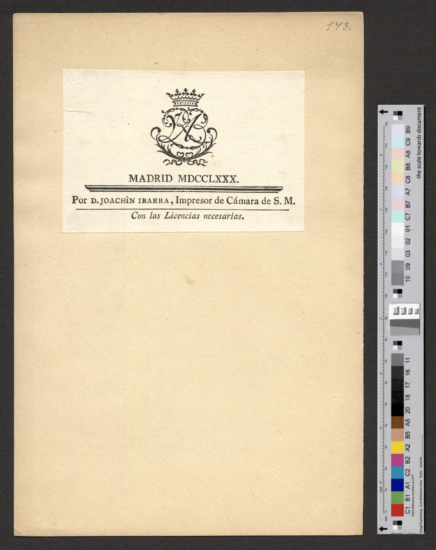 - MADRID MDCCLXXX. / POR D. JOACHÎN IBARRA, Impresor de Cámara de S. M. / Con las Licencias necesarias.