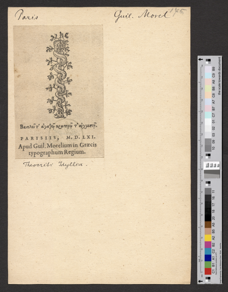- PARISIIS, M. D. LXI. / Apud Guil. Morelium in Graecis / typographum Regium.