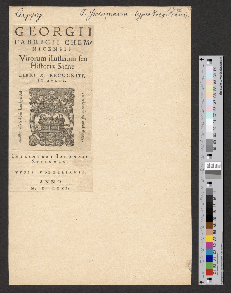 - IMPRIMEBAT IOHANNES STEINMAN. / TYPIS VOEGELIANIS. / ANNO / M. D. LXXI.