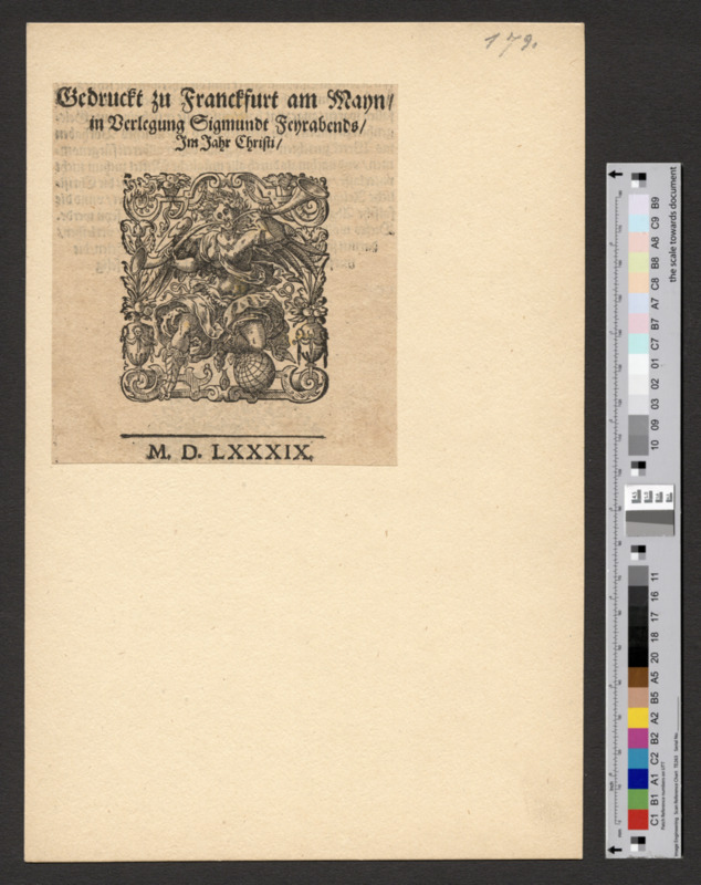 - Gedruckt zu Franckfurt am Mayn / / in Verlegung Sigmunde Feyrabends / / Im Jahr Christi / / M. D. LXXXIX.