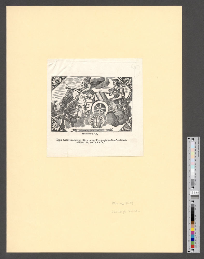 - MOGUNTIAE, / Typis CHRISTOPHORI KÜCHLERI, TYpographi Aulico-Academici. / ANNO M. DC. LXXIX.