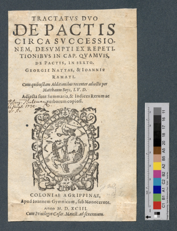 - COLONIAE AGRIPPINAE, / Apud Ioannem Gymnicum, sub Monocerote. / Anno M. D. XCIII. / Cum Priuilegio Caesar, Maiest. ad sexennium.