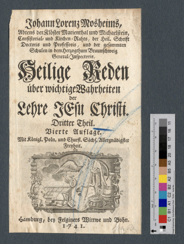 - Titelblatt mit dem Druckerzeichen von Theodor Christoph Felginers Witwe und Sohn