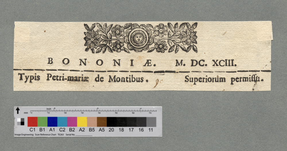 - BONONIAE. M. DC. XCIII. / Typis Petri-mariae de Montibus. Superiorum permissu.