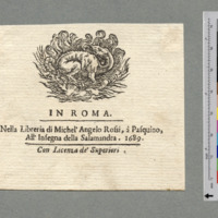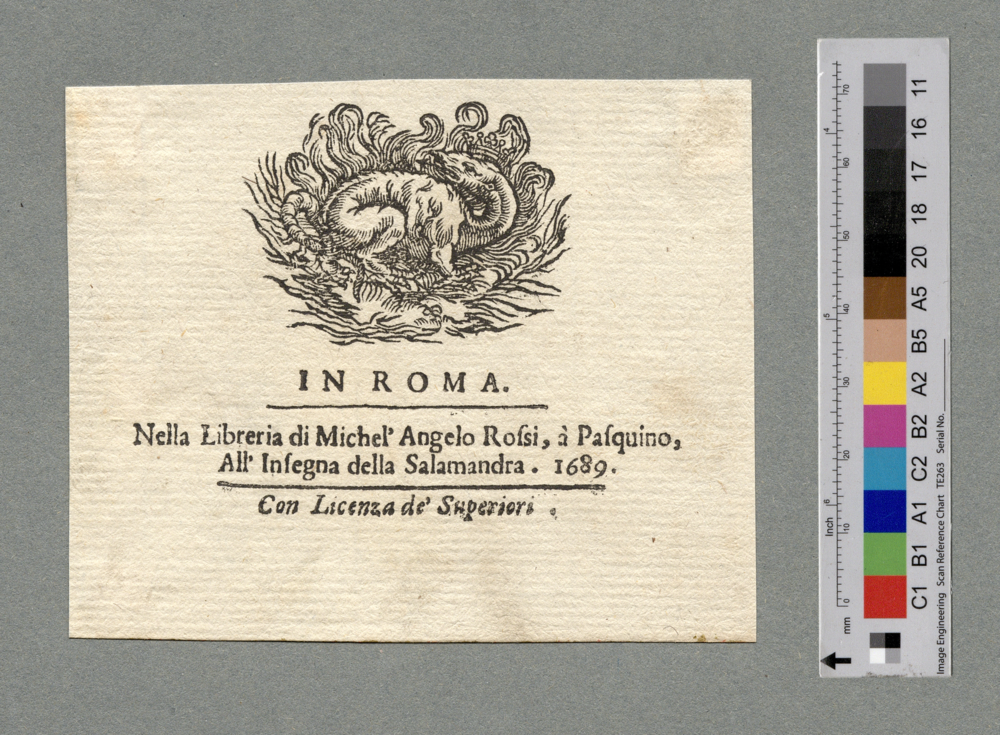 - IN ROMA. / Nella Libreria di Michel' Angelo Rossi, à Pasquino, / All Insegna della Salamandra. 1689. / Con Licenza de' Superiori.