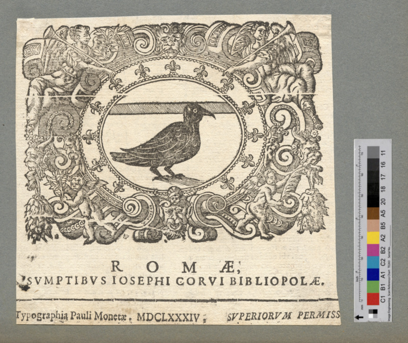 - ROMAE, / SVMPTIBVS IOSEPHI CORVI BIBLIOPOLAE. / Typographia Pauli Monetae. MDCLXXXIV. SVPERIORVM PERMISS[U]