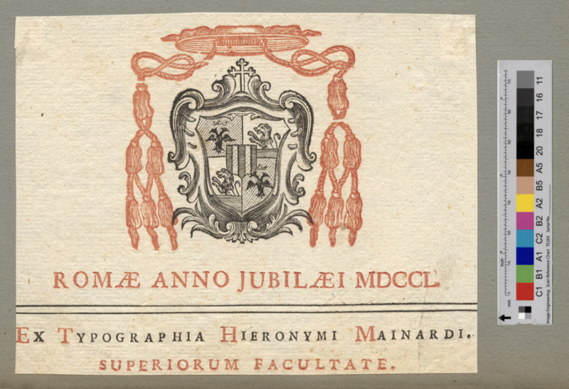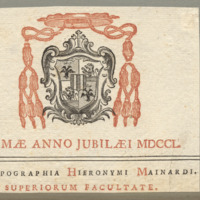 - ROMAE ANNO JUBILAEI MDCCL. / EX TYPOGRAPHIA HIERONYMI MAINARDI. / SUPERIORUM FACULTATE.