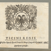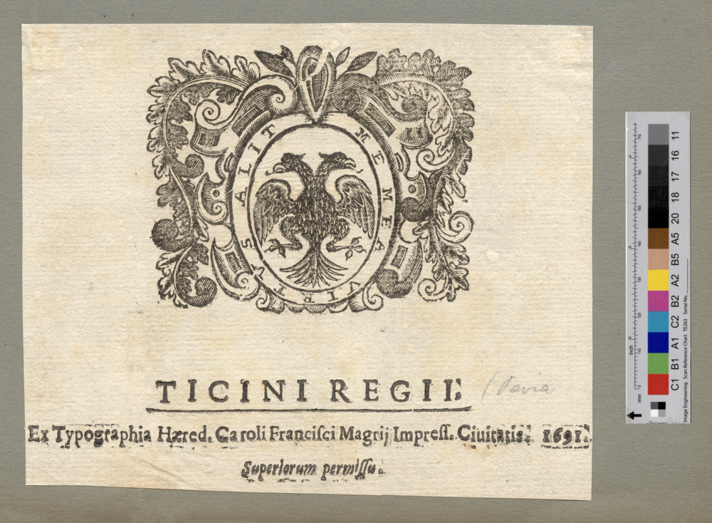 - "TICINI REEGII; / Ex Typographia Haered. Caroli Francisci Magrij Impress. Ciuitatis. 1691. / Superiorum permissu."