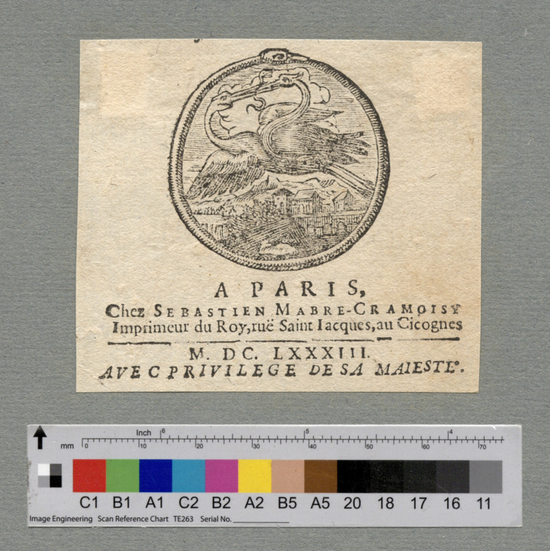 - A PARIS, / Chez SEBASTIEN MABRE-CRAMOISY / Imprimeur du Roy, ruë Saint Iacques, au Cicognes / M. DC. LXXXIII. / AVEC PRIVILEGE DE SA MAIESTE.