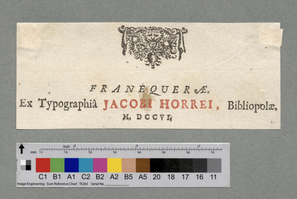 - FRANEQUERAE. / Ex Typographiâ JACOBI HORREI, Bibliopolae. / M. DCCVI.