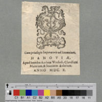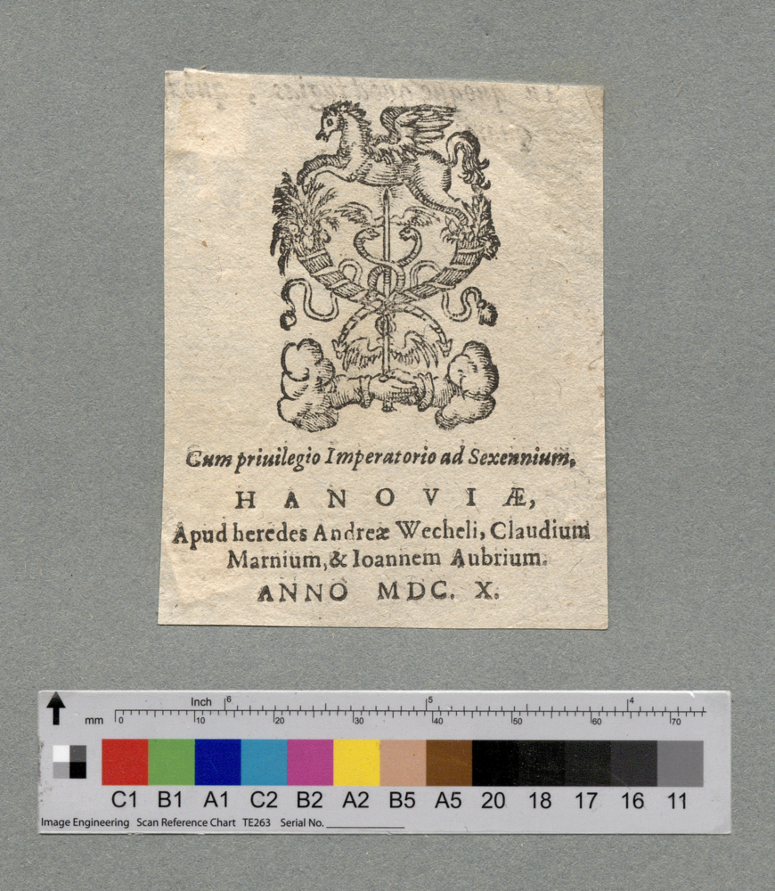 - HANOVIAE, / Apud heredes Andreae Wecheli, Claudium / Marnium & Ioannem Aubrium. / ANNO MDC. X.