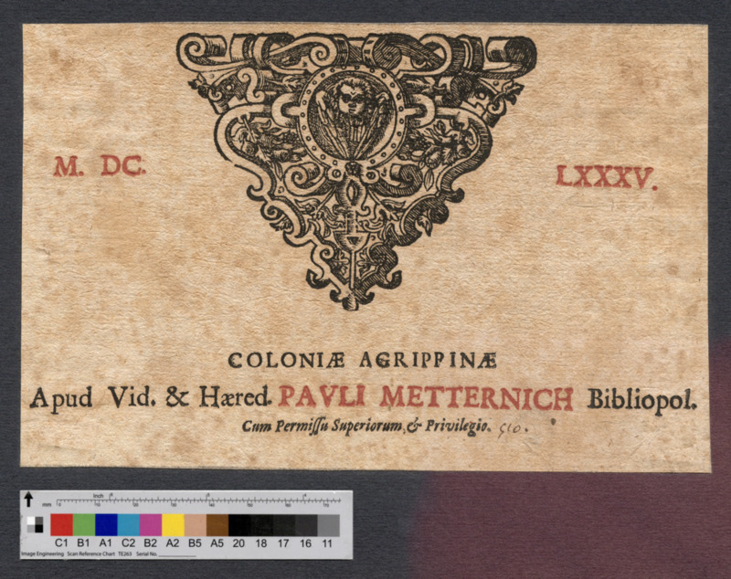 - M. DC. LXXXV. / COLONIAE AGRIPPINAE / Apud Vid. & Haered. PAVLI METTERNICH Bibliopol. / Cum Permissu Superiorum & Privilegio.