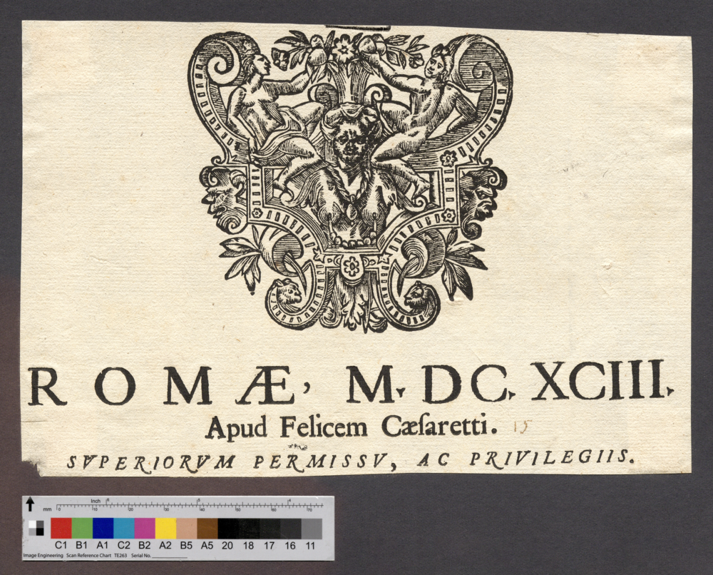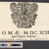- ROMAE, M.DC.XCIII. / Apud Felicem Caesaretti. / SVPERIORVM PERMISSV, AC PRIVILEGIIS.