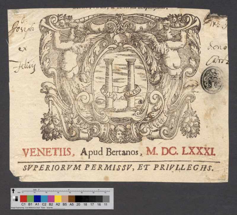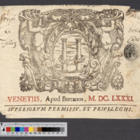 - VENETIIS, Apud Bertanos, M. DC. LXXXI. / SVPERIORVM PERMISSV, ET PRIVILEGIIS.