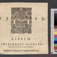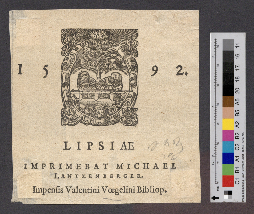 - 15 92. / LIPSIAE / IMPRIMEBAT MICHAEL / LANTZENBERGER. / Impensis Valentini Voegelini Bibliop.
