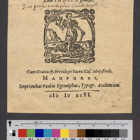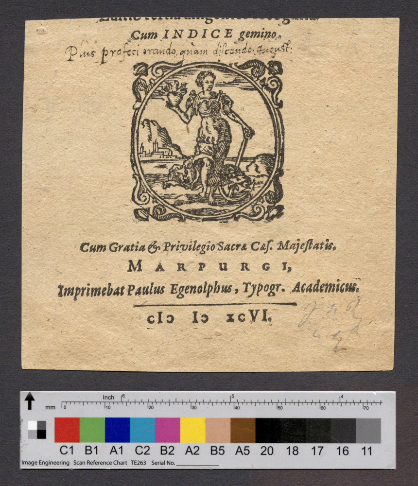 - Cum Gratia & Privilegio Sacrae Caes. Majestatis. / MARPURGI, / Imprimebat Paulus Egenolphus, Typogr. Academicus. / cIɔ Iɔ xcVI.