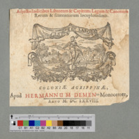 - COLONIAE AGRIPPINAE, / Apud HERMANNUM DEMEN sub Monocerote, / ANNO M. DC. LXXVIII.