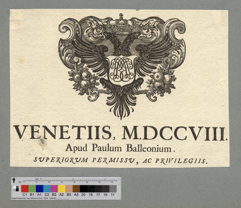 - VENETIIS, M.DCCVIII. / Apud Paulum Balleonium. / SUPERIORUM PERMISSU, AC PRIVILEGIIS.