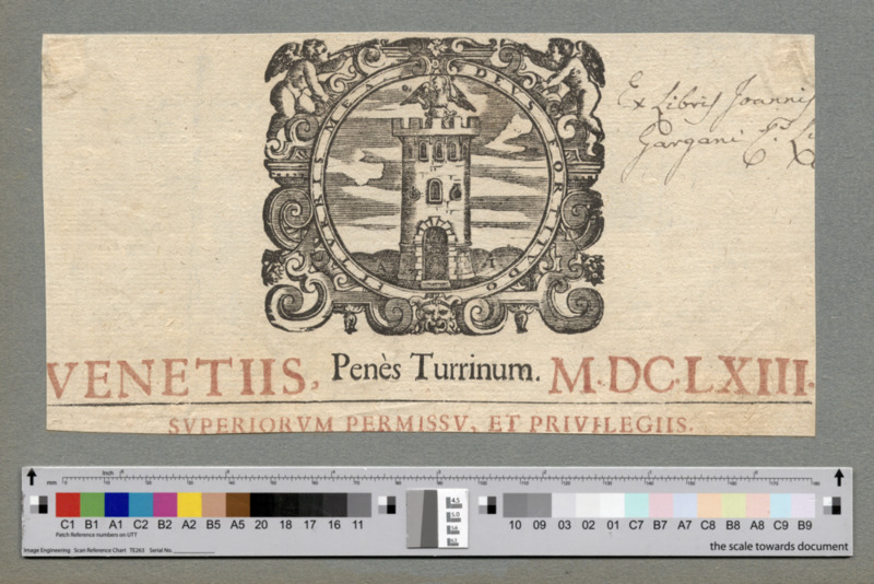 - VENETIIS, Penès Turrinum. M.DC.LXIII. / SVPERIORVM PERMISSV, ET PRIVILEGIIS.
