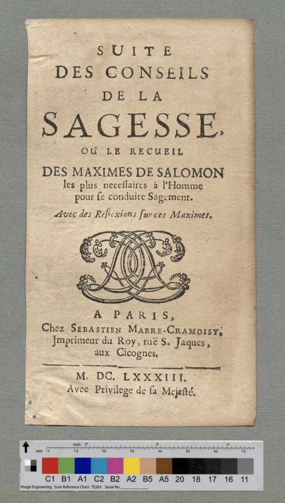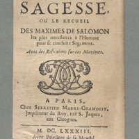 - A PARIS, / Chez SEBASTIEN MABRE-CRAMOISY, / Imprimeur du Roy, ruë S. Jaques, / aux Cicognes. / M. DC. LXXXIII. / Avec Privilege de sa Mejesté.