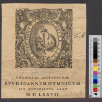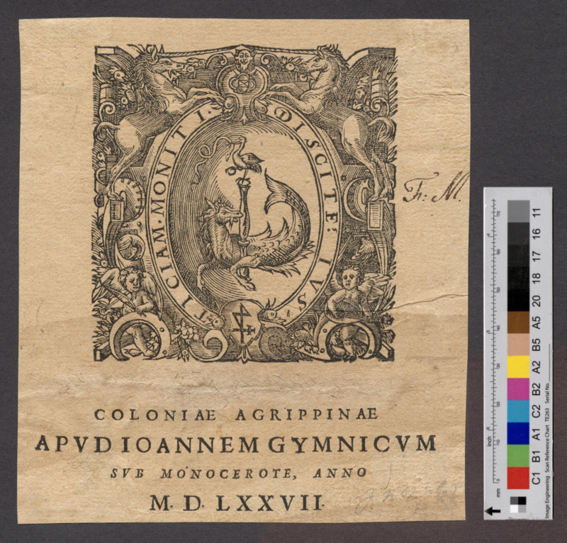 - COLONIAE AGRIPPINAE / APVD IOANNEM GYMNICVM / SVB MONOCEROTE, ANNO / M. D. LXXVII.
