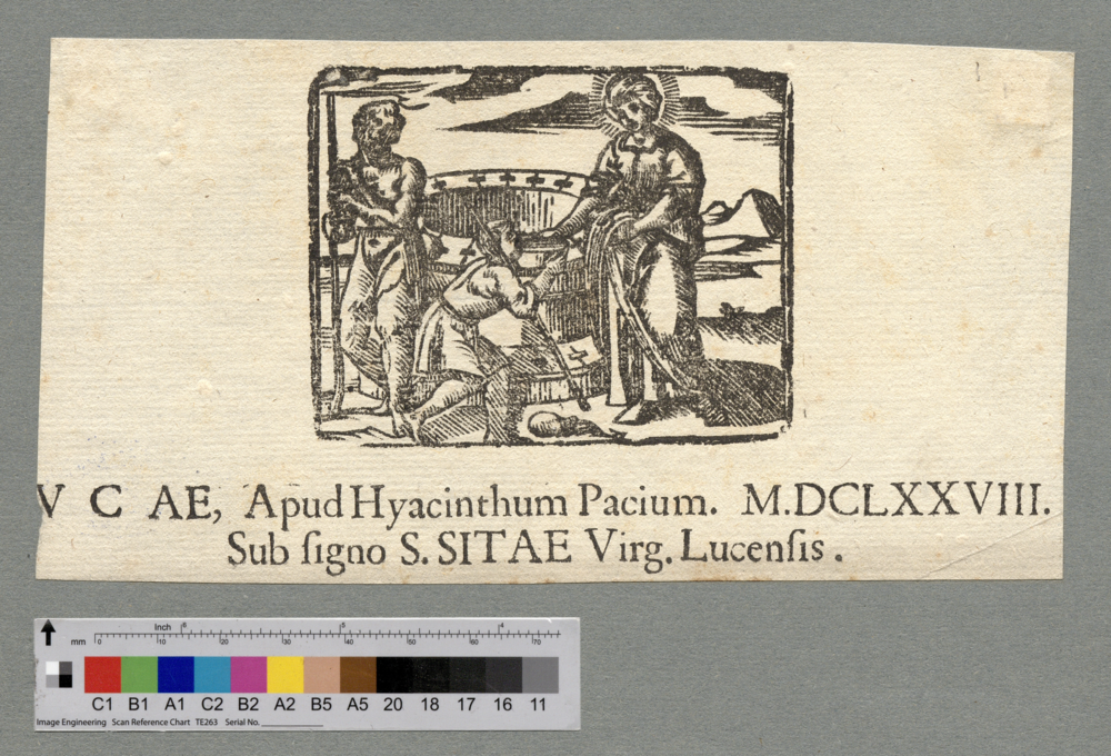 - [L]VCAE, Apud Hyacinthum Pacium. M.DCLXXVIII. / Sub signo S.SITAE Virg. Lucensis.