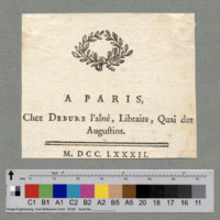- A PARIS, / Chez DEBURE l'aîné, Libraire, Quai des / Augustins. / M. DCC. LXXXII.