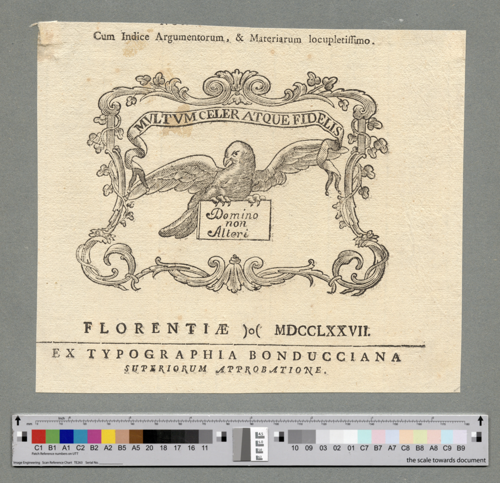 - FLORENTIAE MDCCLXXVII. / EX TYPOGRAPHIA BONDUCCIANA / SUPERIORUM APPROBATIONE.
