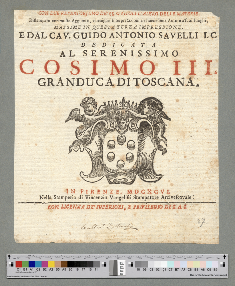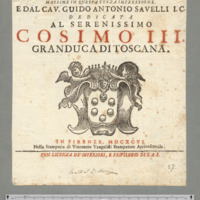- IN FIRENZE MDCXCVI. / Nella Stamperia di Vincenzio Vangelisti Stampatore Arcivescovale. / CON LICENZA DE' SUPERIORI, E PRIVILEGIO DIS.A.S.