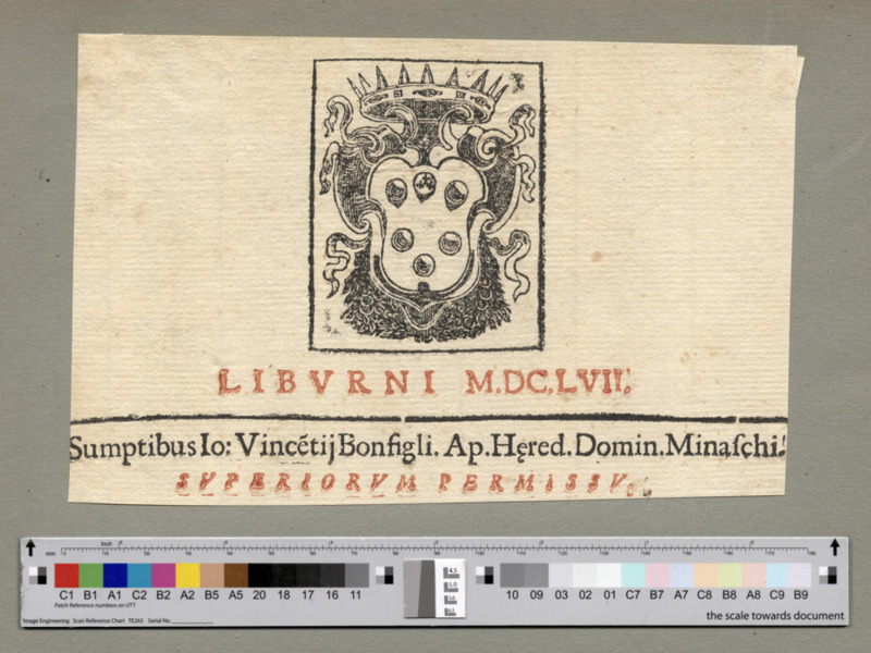 - LIBVRNI M.DC.LVII. / Sumptibus Io: Vincétij Bonfigli. Ap. Hered. Domin. Minaschi. / SVPERIORVM PERMISSV.