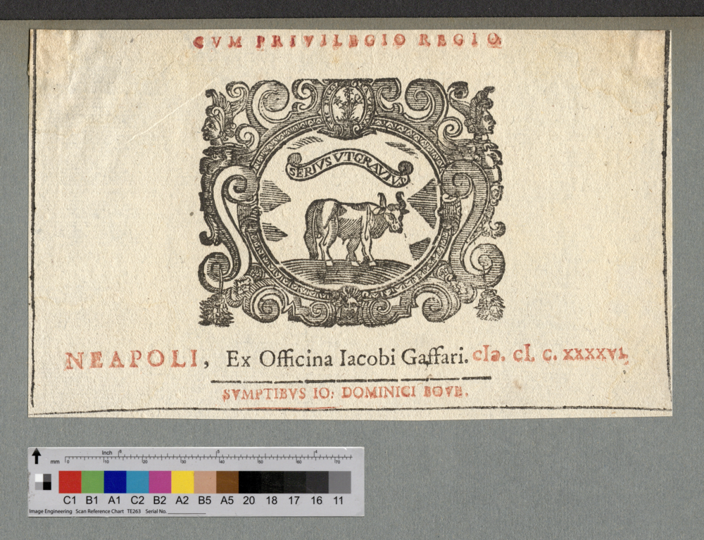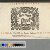 - NEAPOLI, Ex Officina Iacobi Gaffari. cIɔ. cI. c. XXXVI. / SVMPTIBVS IO: DOMINICI BOVE.