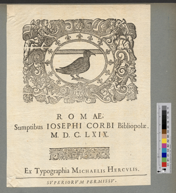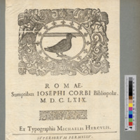 - "ROMAE; / Sumptibus IOSEPHI CORBI Bibliopolae. / M. D. C. LXIX. / Ex Typographia MICHAELIS HERCVLIS. / SVPERIORVM PERMISSV."