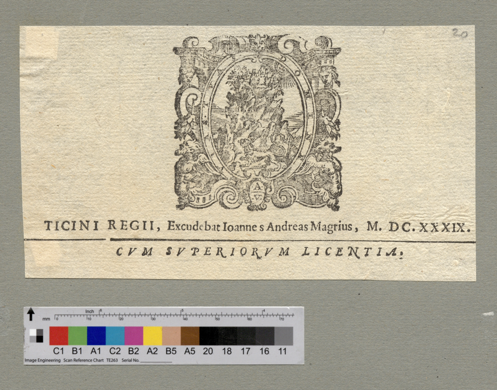 - TICINI REGII, Excudebat Ioannes Andreas Magrius, M. DC. XXXIX. / CVM SVPERIOVM LICENTIA.