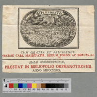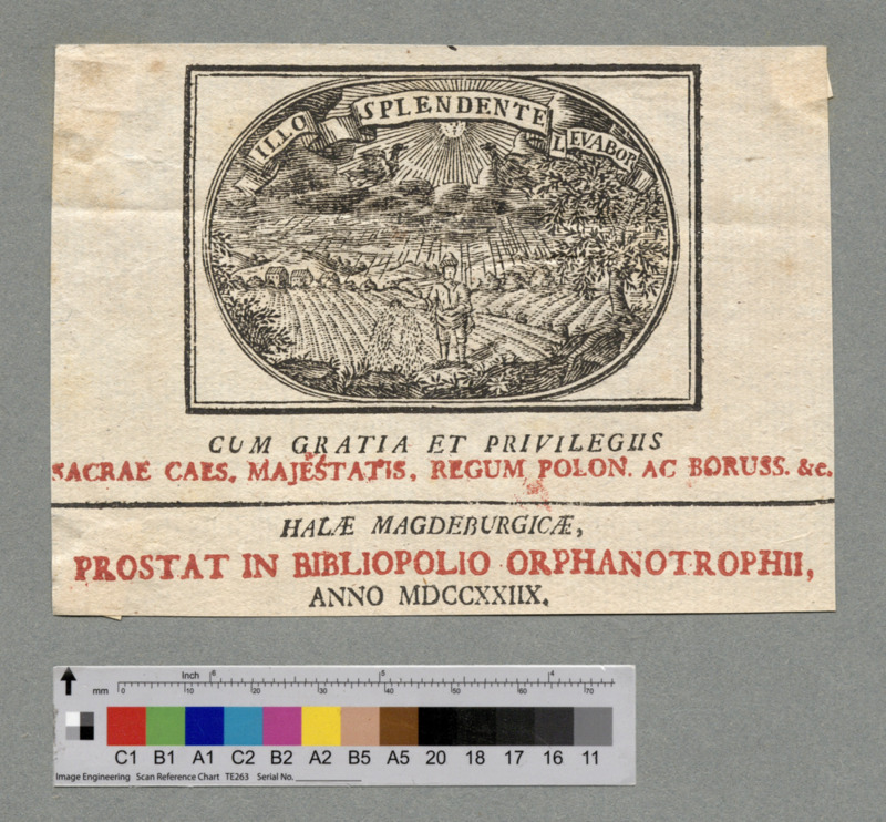 - CUM GRATIA ET PRIVILEGIIS / SACRAE CAES. MAJESTATIS, / REGUM POLON. AC BORUSS. &e. / HALAE MAGDEBURGICAE, / PROSTAT IN BIBLIOPOLIO ORPHANOTROPHII, / ANNO MDCCXXIIX.