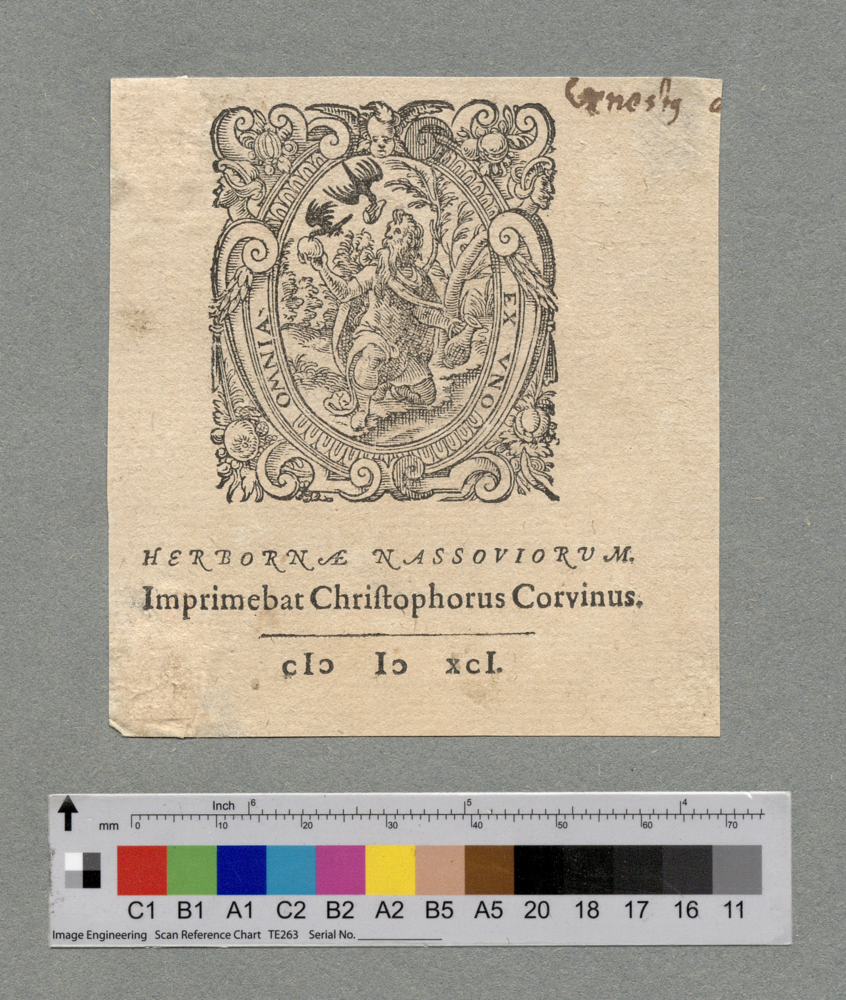 - HERBORNAE NASSOVIORUM. / Imprimebat Christophorus Corvinus. / cIↄ Iↄ xcI.