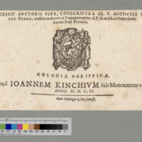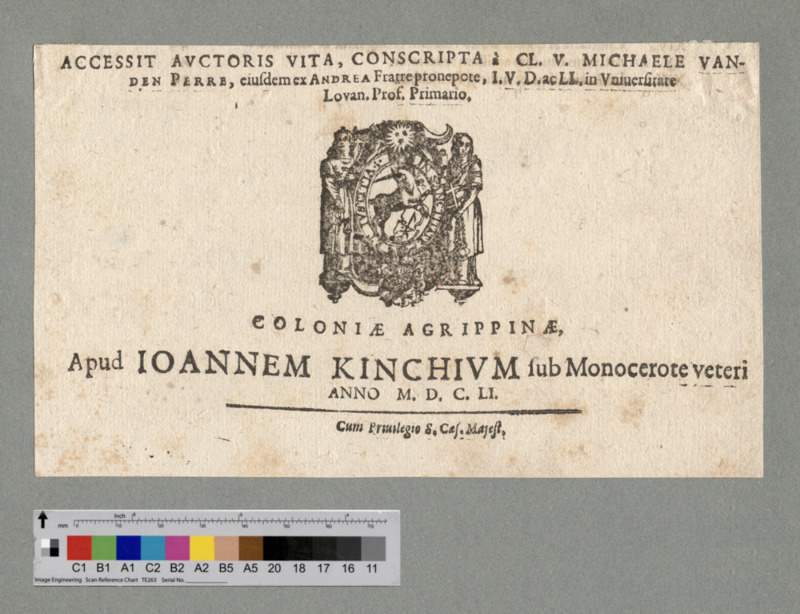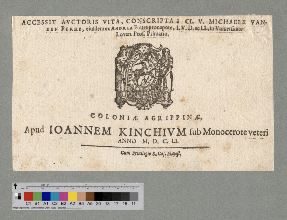 - COLONIAE AGRIPPINAE, / Apud IOANNEM KINCHIVM sub Monocerote veteri / ANNO M. D. C. LI. / Cum Privilegio S. Cas. Majest.