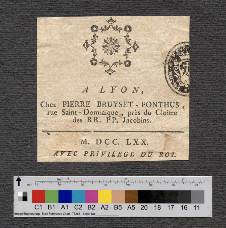 - A LYON, / Chez PIERRE BRUYSET-PONTHUS, / rue Saint-Dominique, pès du Cloître / des PR. PP. Jacobins. / M. DCC. LXX. / AVEC PRIVILEGE DU ROI.
