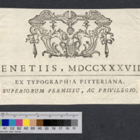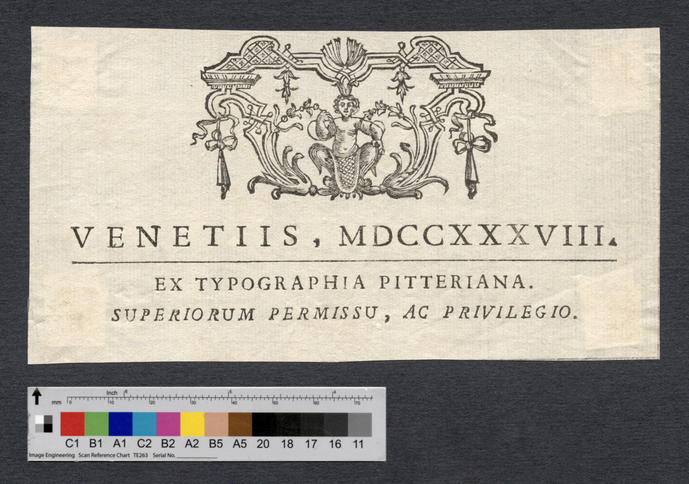 - VENETIIS, MDCCXXXVIII. / EX TYPOGRAPHIA PITTERIANA. / SUPERIORUM PERMISSU, AC PRIVILEGIO.