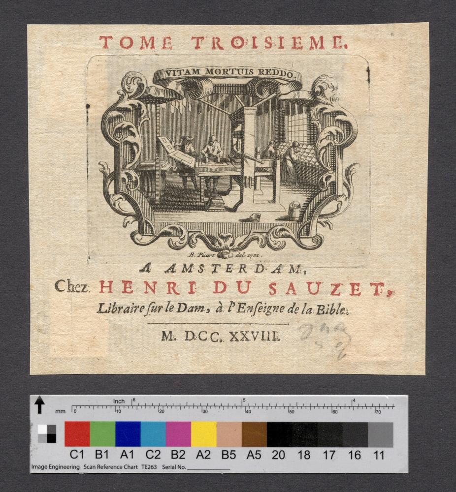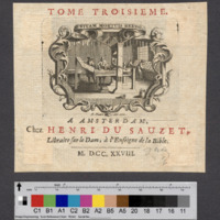 - A AMSTERDAM, / Chez HENRI DU SAUZET, / Libraire sur le Dam, à l'Enseigne de la Bible. / M. DCC. XXVIII.