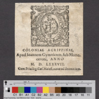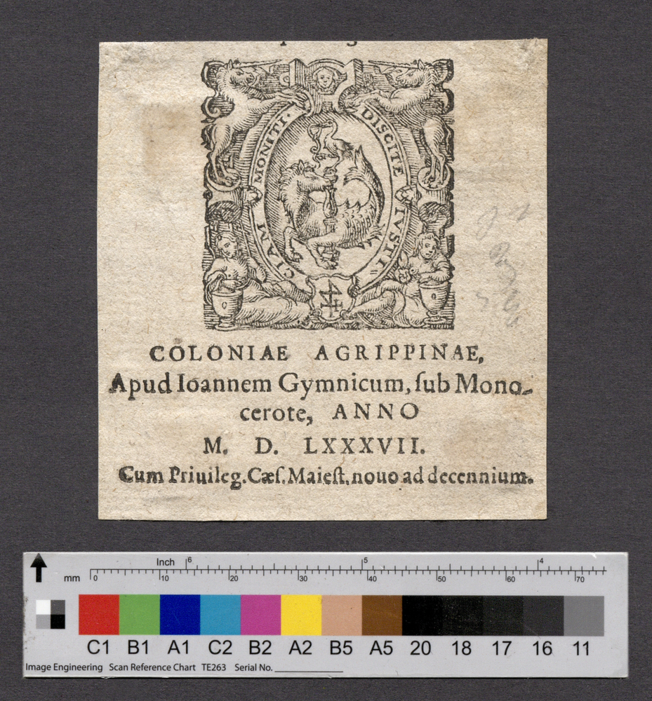 - COLONIAE AGRIPPINAE, / Apud Ioannem Gymnicum, sub Mono- / cerote, ANNO / M. D. LXXXVII. / Cum Priuileg.Caes.Maiest.nouo ad decennium.